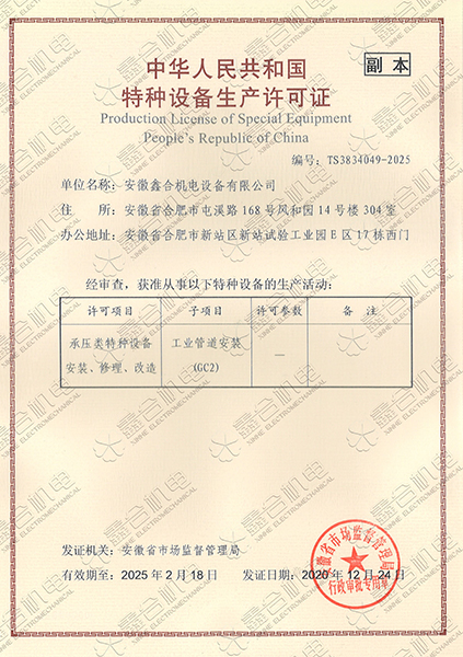 目前我公司具有建筑機(jī)電安裝工程專業(yè)承包一級資質(zhì)、總承包二級、GC2壓力管道設(shè)計、施工資質(zhì)。現(xiàn)有高級工程師5名、高級技師55名、工程師22名、助工25名、技術(shù)員22名、各類專業(yè)技師50多名,強大的技術(shù)力量及精良的施工隊伍,為客戶提供全方位服務(wù)。 公司本著“一切為了用戶”的經(jīng)營理念,“以品質(zhì)求生存、以誠信贏市場、以管理促發(fā)展”為要求,努力為廣大客戶提供專業(yè),優(yōu)質(zhì)、高效的服務(wù)。